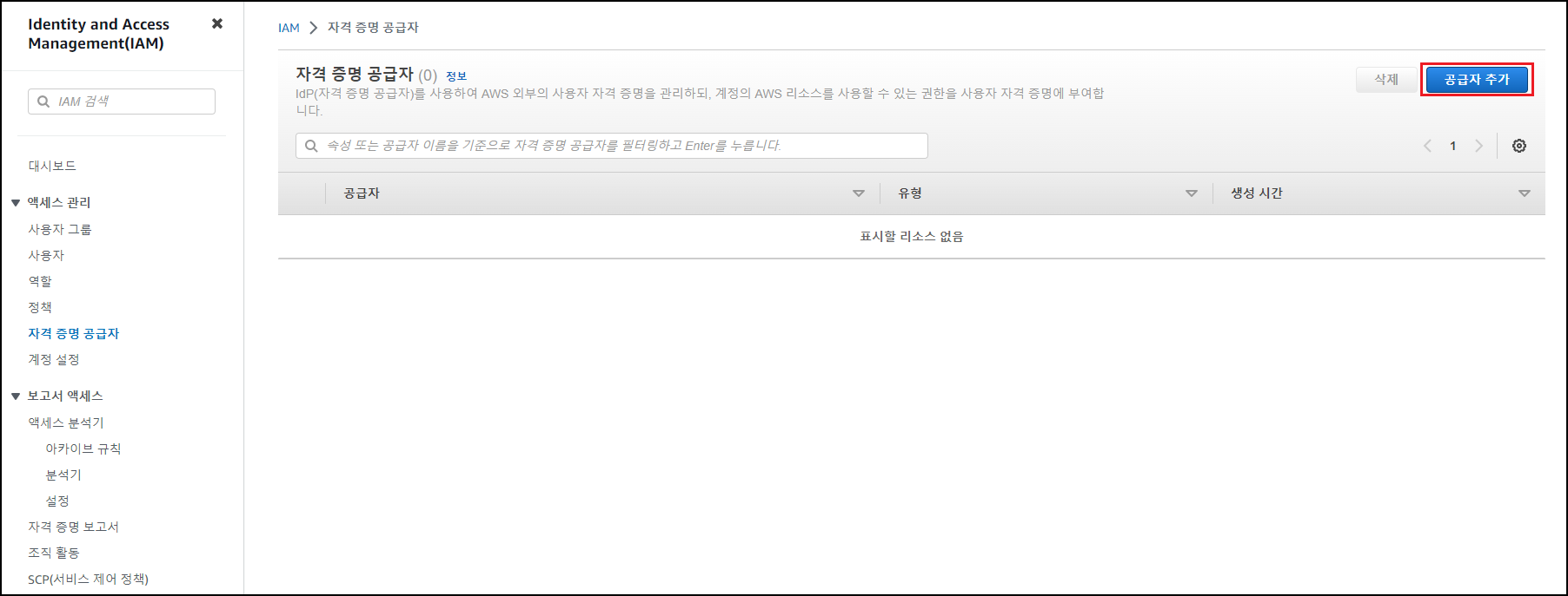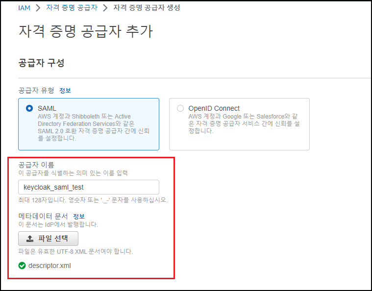 AWS IAM 자격 증명 공급자에서 공급자를 추가합니다. 방금전 다운로드 받은 IdP metadata를 업로드 합니다.