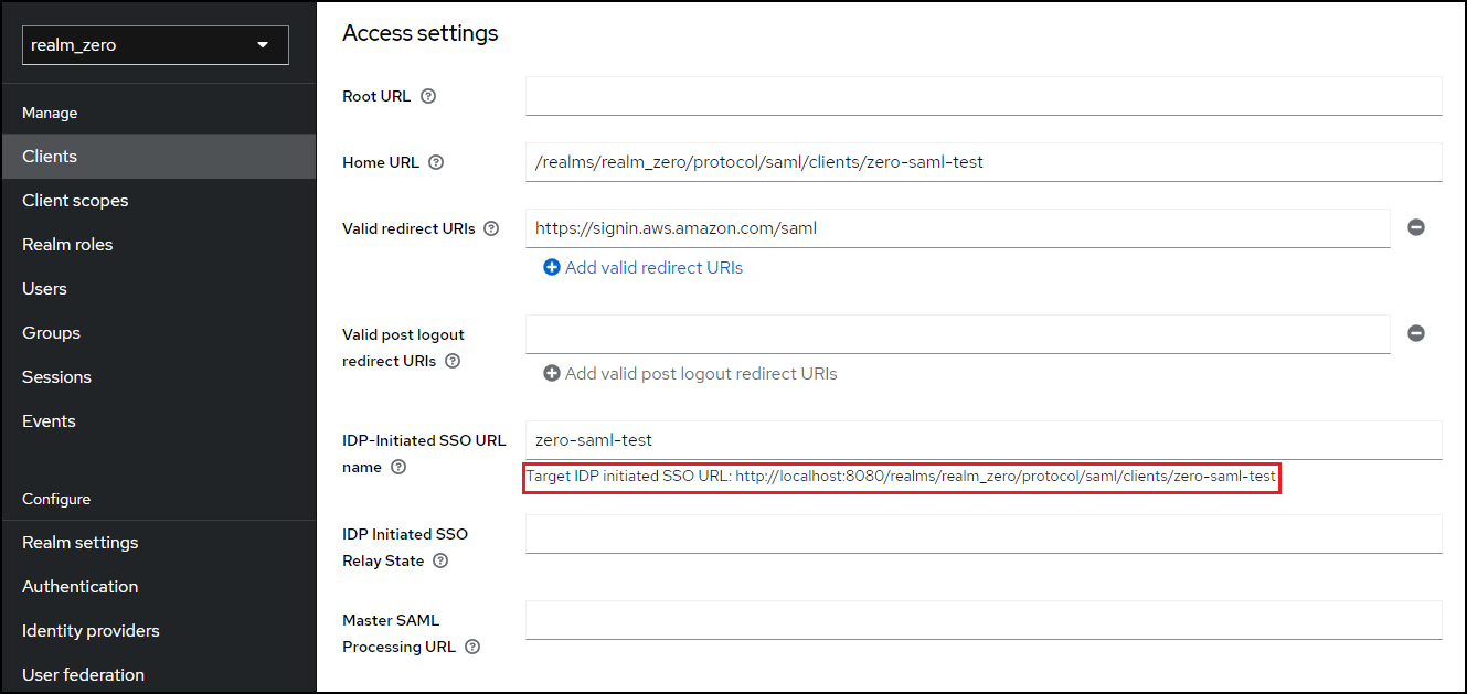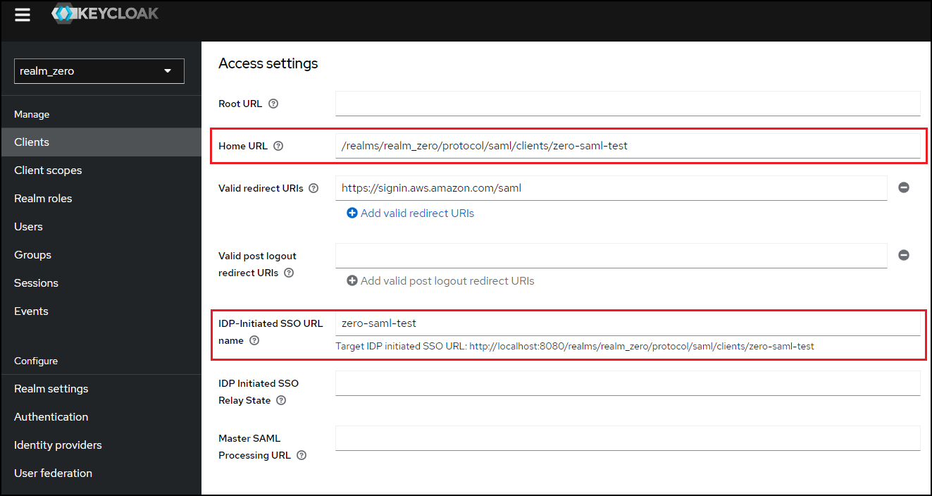 AWS의 SAML metada를 clients 설정에 추가해야 합니다. 조금전 생성한 clients(urn:amazon:webservices)에서 Home URL과 IDP URL을 설정합니다.