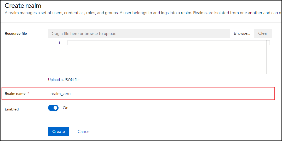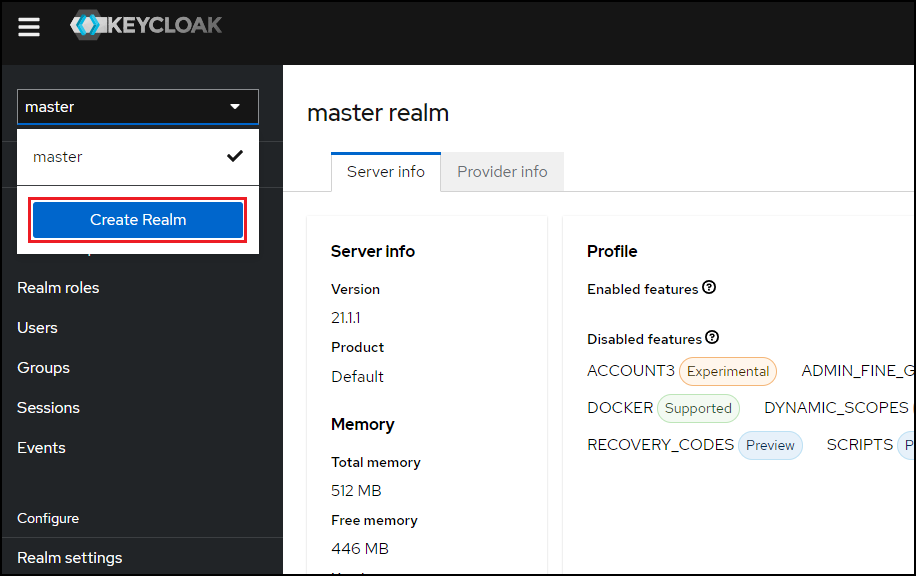 Keycloak 어드민 페이지(http://localhost:8080/admin)로 접속하여 컨테이너 생성 시 설정한 계정 정보를 입력해 로그인 합니다. 왼쪽 드롭다운 메뉴에서 "Create Realm"을 클릭합니다. Realm 이름을 입력하고 Create를 클릭합니다.