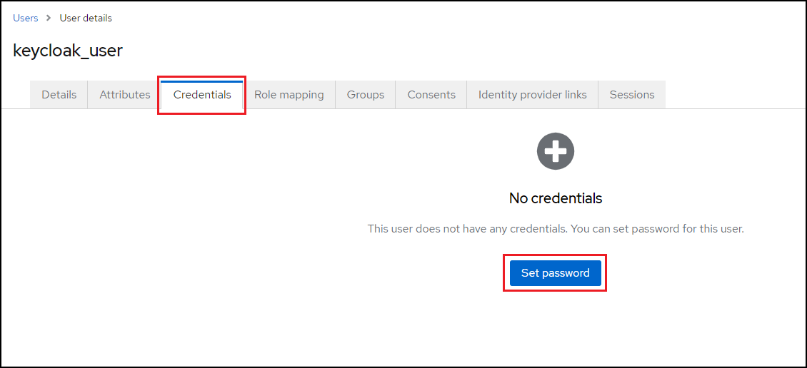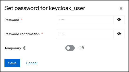 Credentials - Set password를 클릭해 유저의 패스워드를 설정하고 저장합니다. Temporary 옵션을 활성화할 경우 유저가 최초로 로그인했을 때 패스워드 변경을 강제할 수 있습니다.