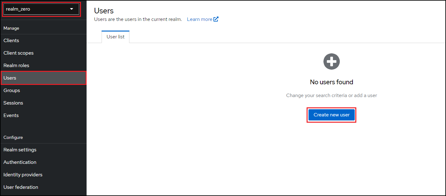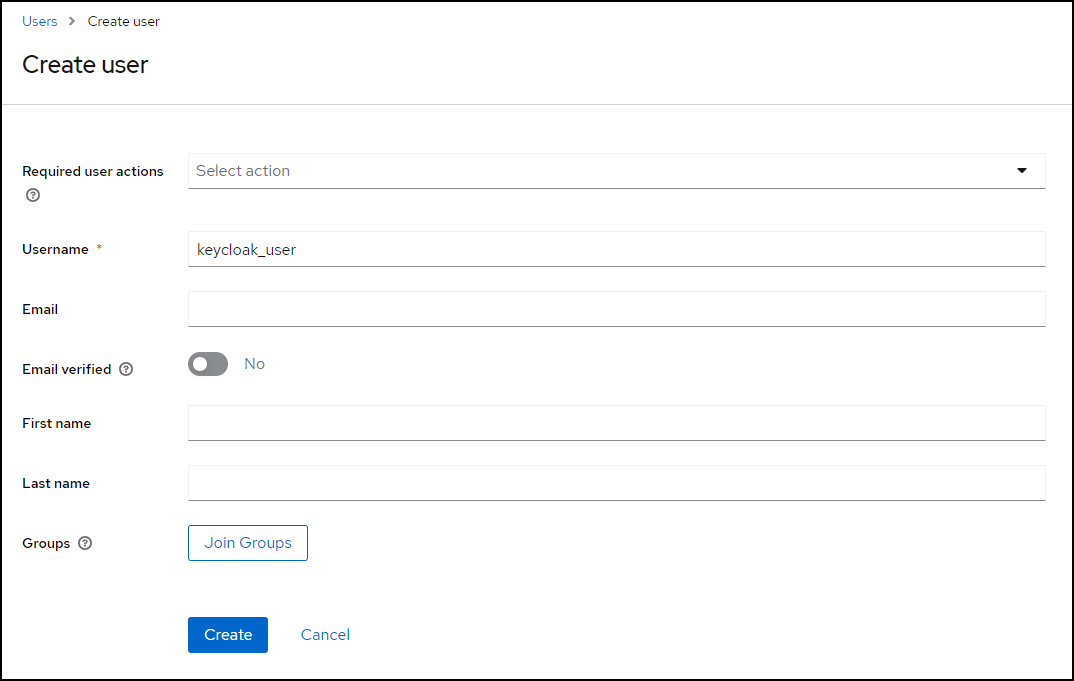 생성한 Realm에서 User - Create new user를 클릭합니다. Username을 비롯한 유저 정보를 입력합니다. Required user actions을 지정해 OTP 설정 패스워드 변경 등을 강제할 수 있습니다.