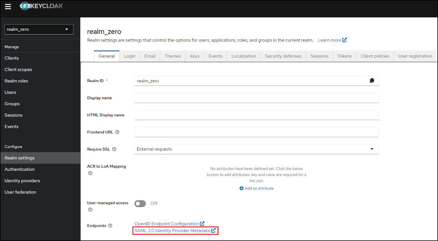 Realm settings 메뉴에서 SAML 2.0 Identity Provider Metadata를 다운로드 합니다.