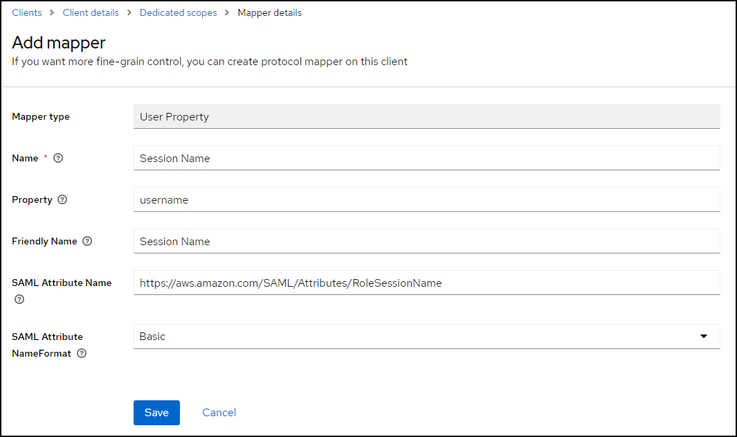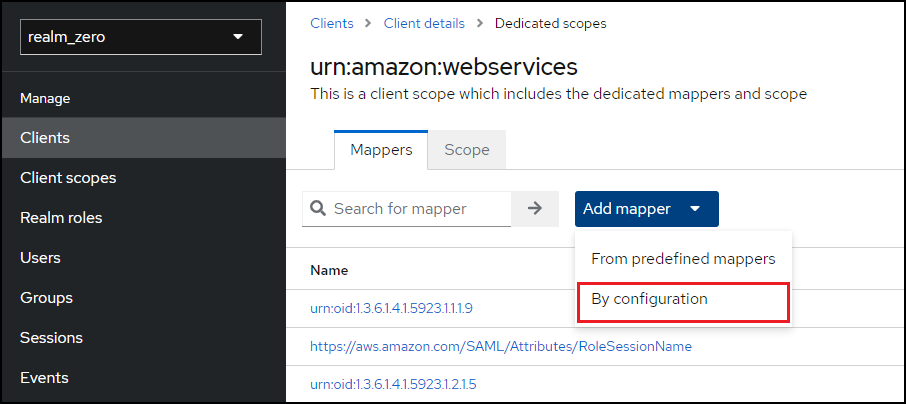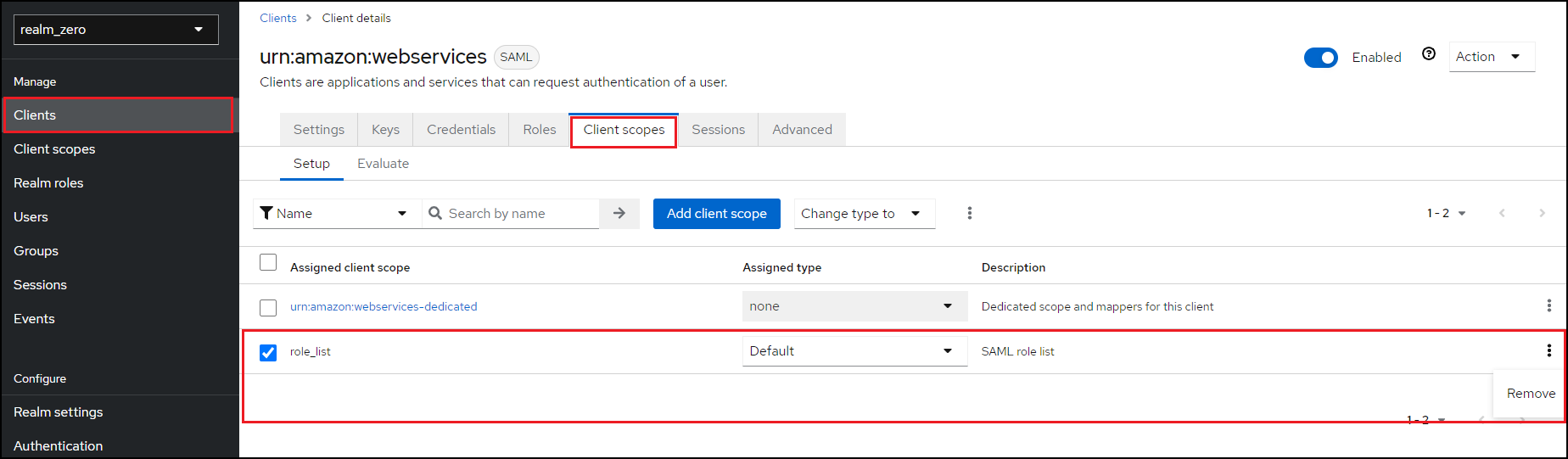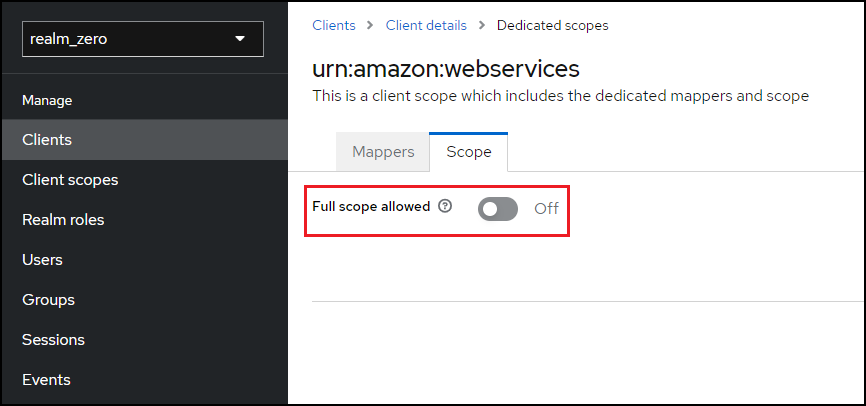 AWS clients의 scopes에서 role_list를 삭제합니다. 그리고 urn:amazon:webservices-dedicated을 클릭해 Scope 메뉴에서 Full scope allowed 설정을 off 합니다.