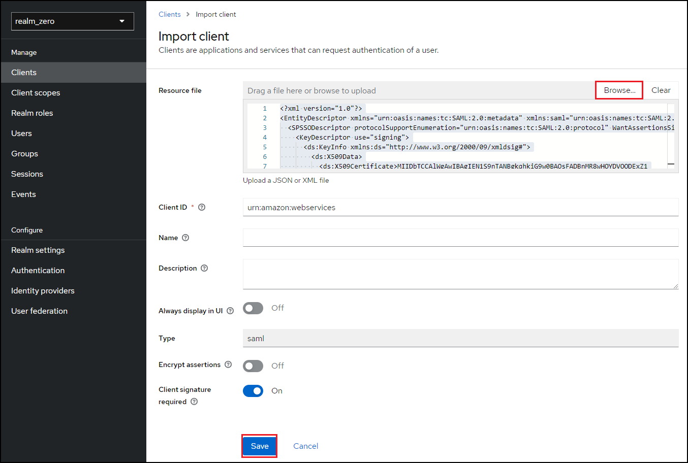 AWS의 SAML metada를 다운로드하고 Keycloak clients로 등록합니다.