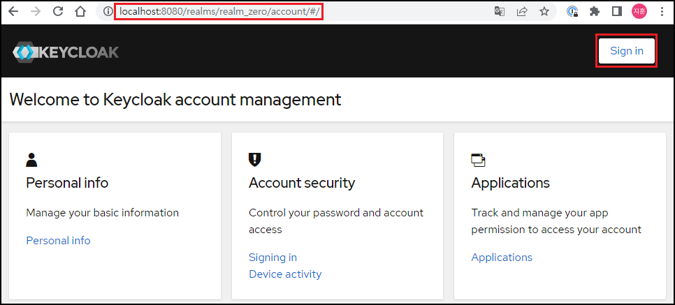 유저 계정 생성 후 사용자 페이지(http://localhost:8080/realms/[렐름이름]/account)로 접속해 "Sign in"을 클릭하여 정상적으로 로그인되는지 확인합니다.