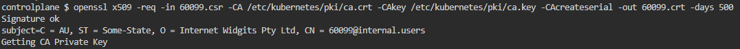 openssl x509 -req -in [name].csr -CA /etc/kubernetes/pki/ca.crt -CAkey /etc/kubernetes/pki/ca.key -CAcreateserial -out [name].crt -days 500