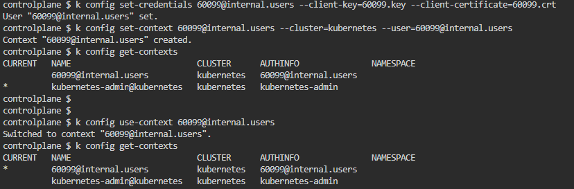 k config set-credentials [name] --client-key=[name].key --client-certificate=[name].crt --embed-certs # config에 유저 추가