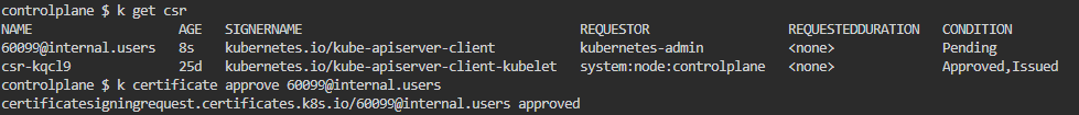- 인증서를 생성하기 위한 작업의 일환으로 유저의 개인키에 대한 사이닝을 K8s의 CA에 요청할때 CertificateSigningRequests API를 사용