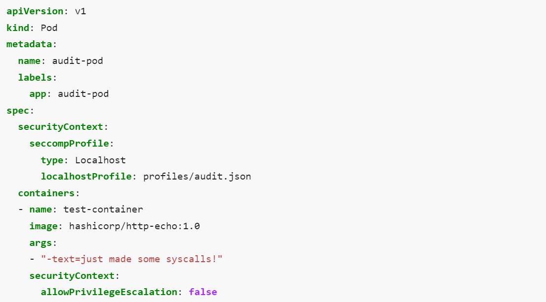 - pod 수준의 securityContext에 seccomp 설정("/var/lib/kubelet/seccomp" 경로를 기본으로 하며 예시의 profiles/audit.json의 의미는 절대 경로로 표현하자면 " /var/lib/kubelet/seccomp/profiles/audit.json" 임)