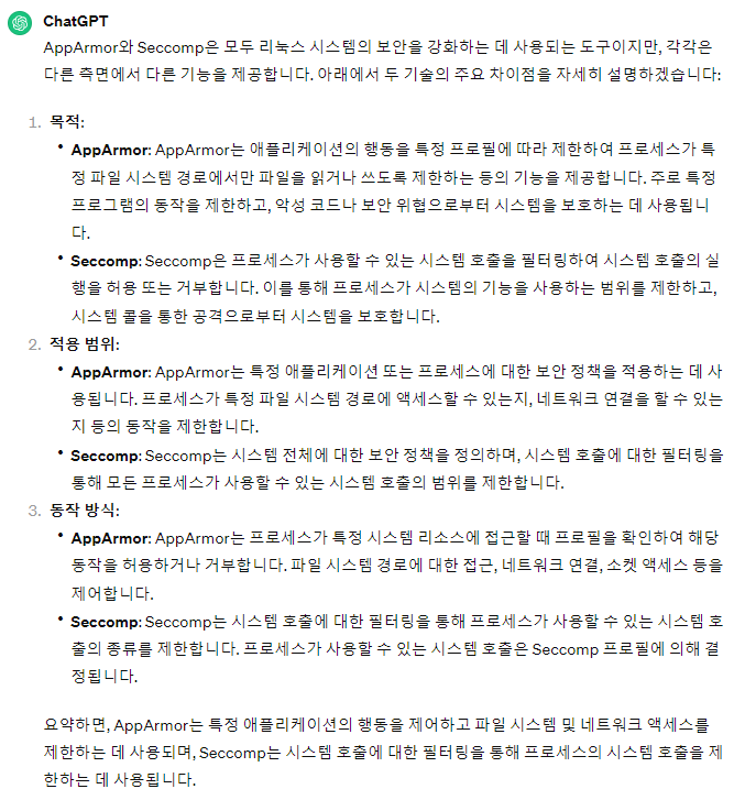 - AppArmor와 비슷한 기능으로 느껴져서 chatGPT한테 차이점을 질의한 결과 아래와 같은 컨셉으로 느껴졌음