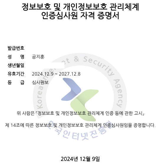 24년도 ISMS-P 인증심사원 자격검정 실기시험 결과가 11.28.에 발표되었습니다. 5월부터 준비를 시작했으니 장장 7개월 만에 막을 내렸네요. 마음 한편에 찝찝하게 남아있던 짐덩어리가 사라져서 홀가분합니다.