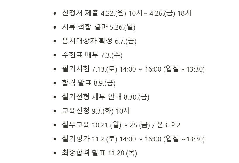 세부적인 일정은 조금씩 다를 수 있지만 큰 틀에서는 향후 시험에서도 큰 변화가 없을 것으로 예상됩니다. 처음 시험을 신청한다면 시험 신청서를 미리 준비해서 빠르게 제출하는 것을 추천드립니다. 작성 및 구비해야 할 서류가 많기 때문에 제출일자에 근접해서 준비하기에는 시간이 무척 촉박합니다.