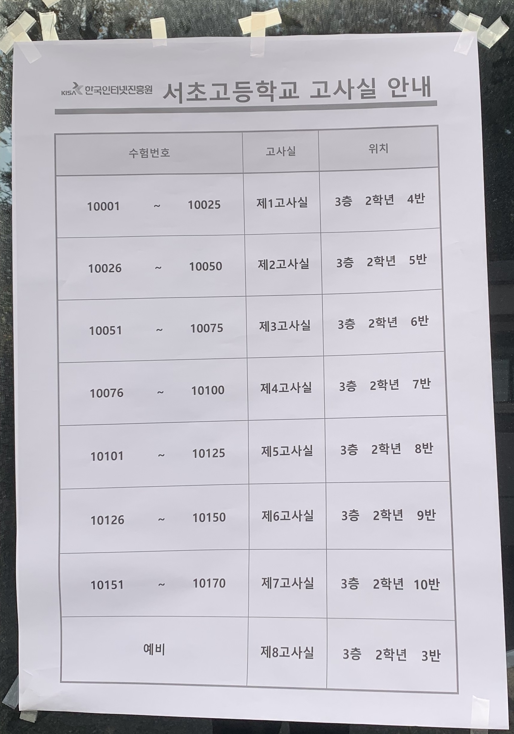정문으로 들어가면 바로 옆 게시판에서 고사실을 확인할 수 있습니다.